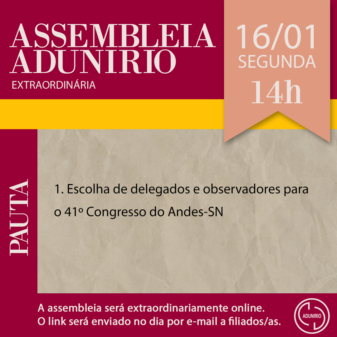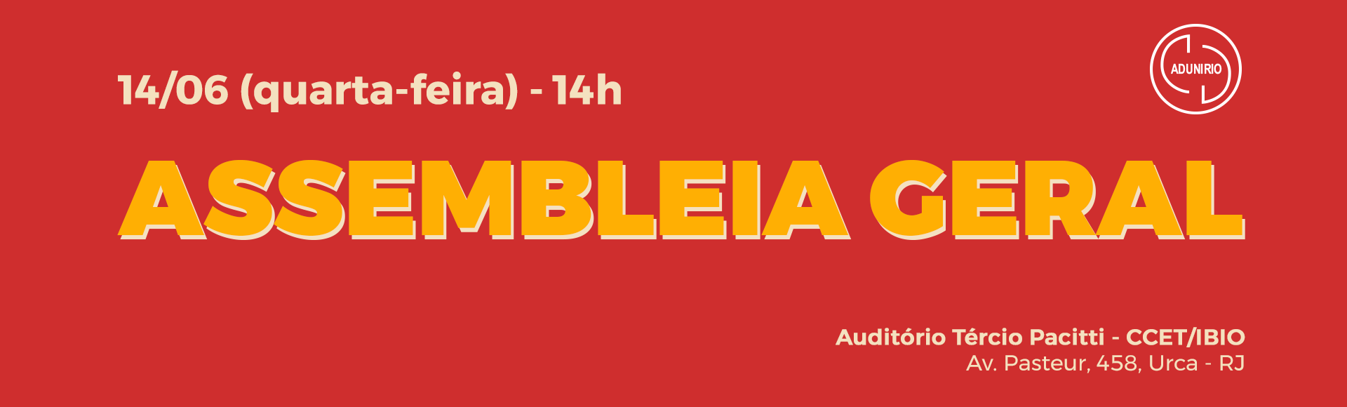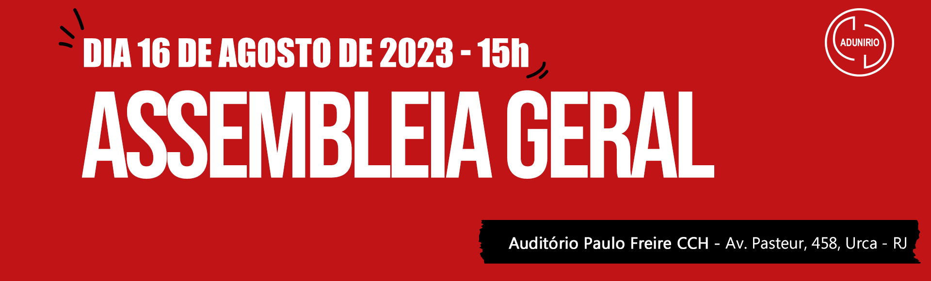 Auditório Paulo Freire - CCH Av. Pasteur, 458, prédio do CCH, Urca, Rio de Janeiro, RJ, Brasil📢Assembleia Geral Adunirio Dia 16 de agosto (quarta-feira), às 15 horas. Esperamos você na quarta-feira da semana que vem para a nossa assembleia. Ela acontecerá presencialmente no auditório Paulo Freire, localizado no prédio do CCH da Unirio. 👉 Pauta: 1. […]