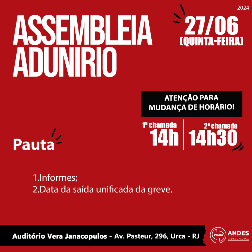 Houve uma mudança de horário na assembleia devido ao Ato Unificado da Educação no Rio de Janeiro, que irá acontecer no dia 27 de junho às 16h no Largo São Francisco de Paula no Centro.