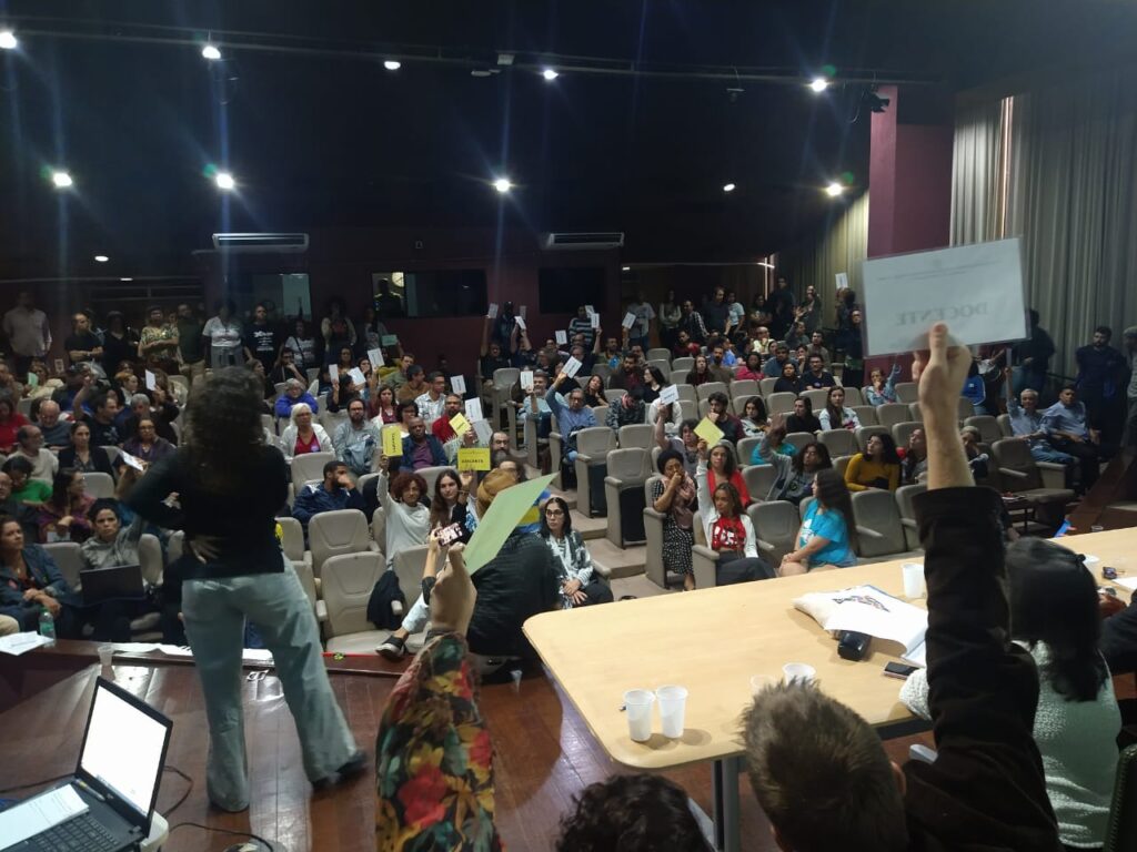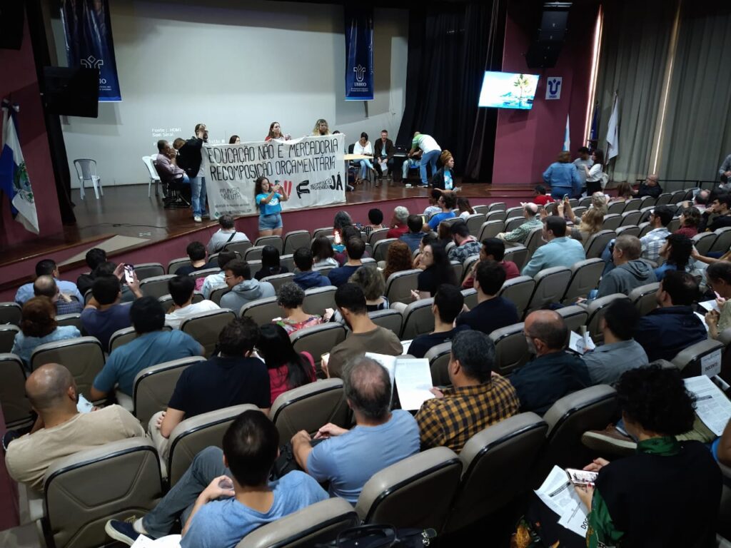 A sessão do Consepe lotou o auditório Vera Janacopulos e foi marcada por uma manifestação organizada e entusiasmada do movimento estudantil com palavras de ordem como “Que contradição! Unirio está em greve e quer dar avaliação!”. A sessão foi exaustiva, se prolongando até o meio da tarde, mas os debates aconteceram de forma qualificada, o que se refletiu na quase unanimidade do resultado.