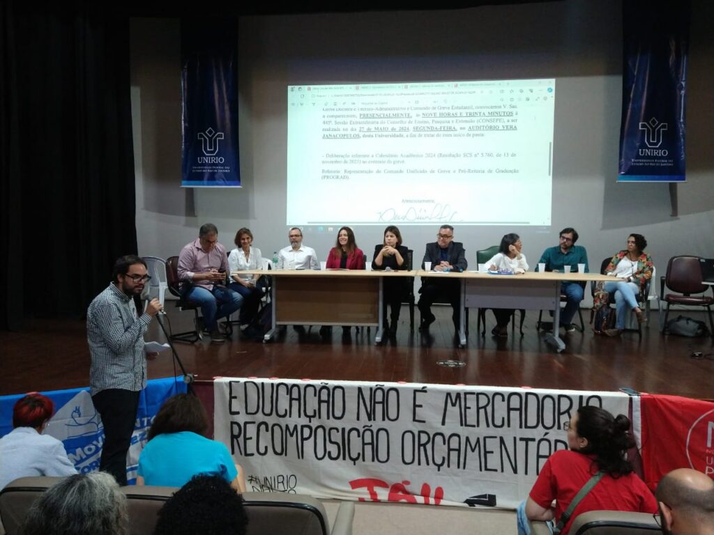 As discussões desta quinta-feira foram abertas com a leitura de uma moção de apoio a greve dos três segmentos da Unirio que foi aprovada por aclamação no Consepe.