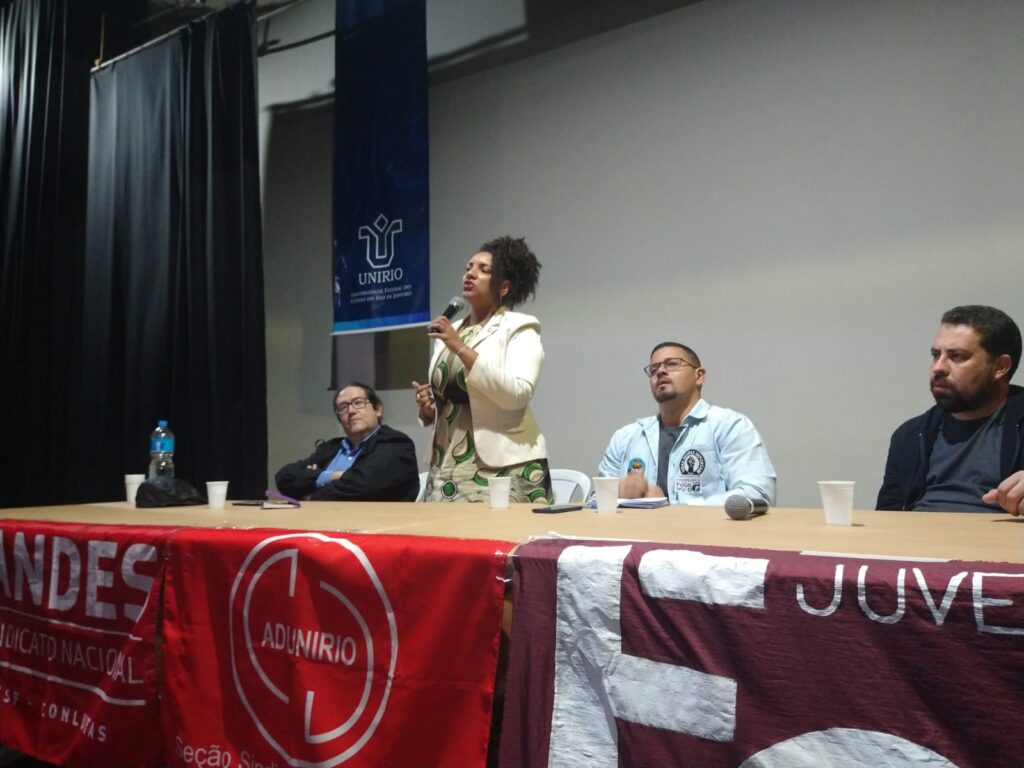 Vinícius Israel, diretor da Adunirio, fez uma fala de abertura lembrando que nossa seção sindical “encara o espaço da universidade como um instrumento de transformação social e redução de desigualdades” e destacou que está na pauta “a luta contra o fascismo e o autoritarismo no Brasil e nas universidades”. Fez referência também à luta atual dos docentes pela carreira e pela reposição das perdas salariais acumuladas ao longo dos últimos anos.